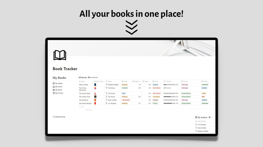 Book Tracker template is for people who don't want to get lost with their books reading progress, because it keeps tracking it for all your books in one place!